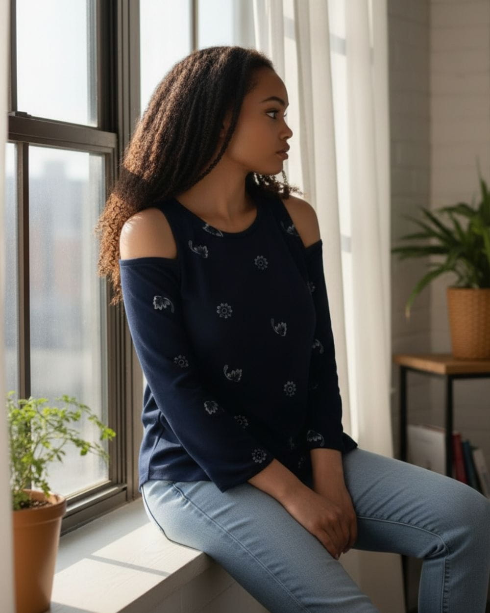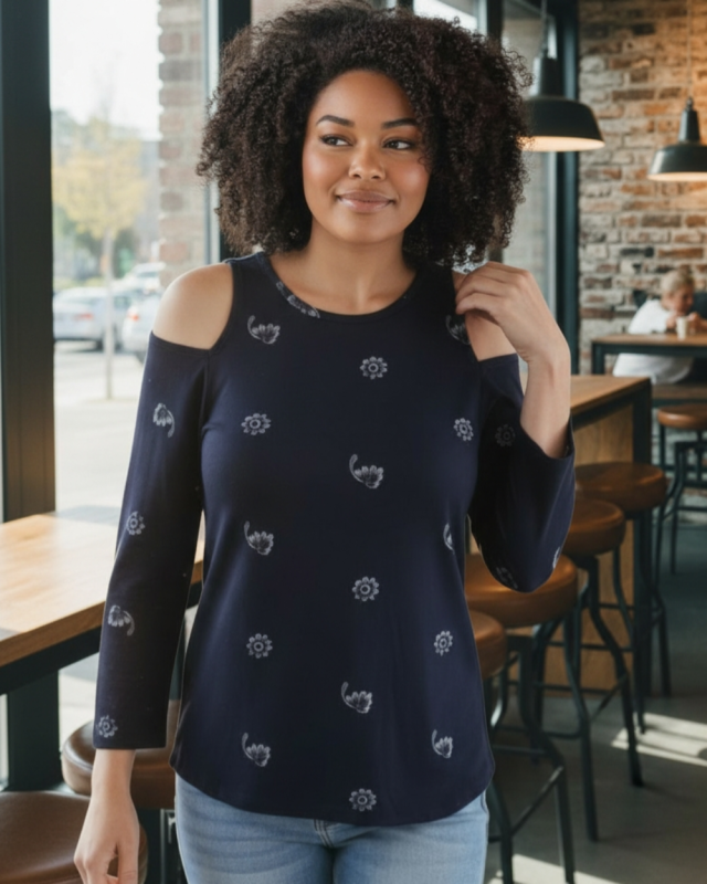 Mięciutka, przyjemna w dotyku i dla ciała bluzka cold shoulder - granatowa z delikatnym, kontrastowym wzorem w kształcie kwiatków i listków.