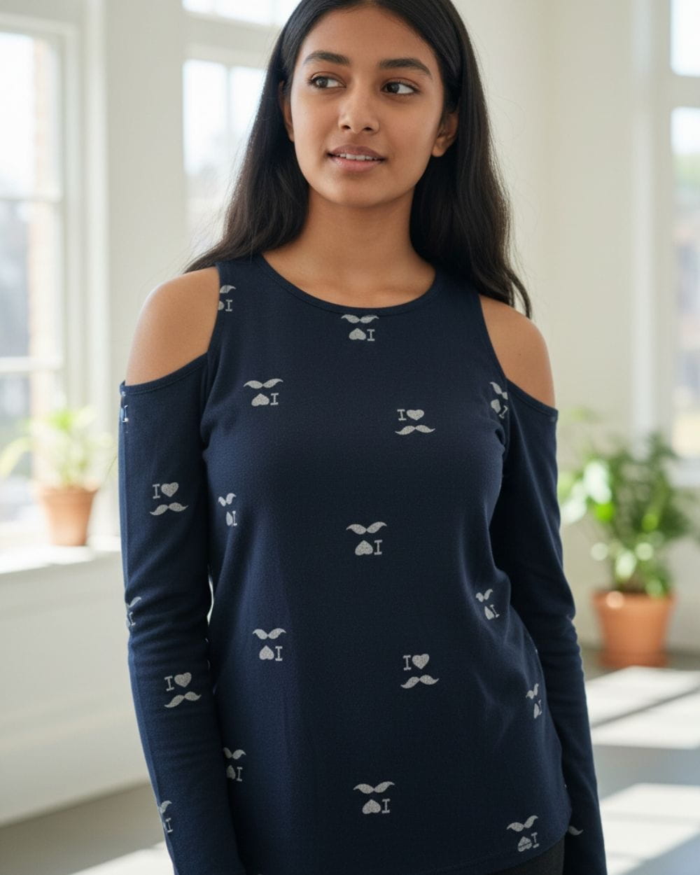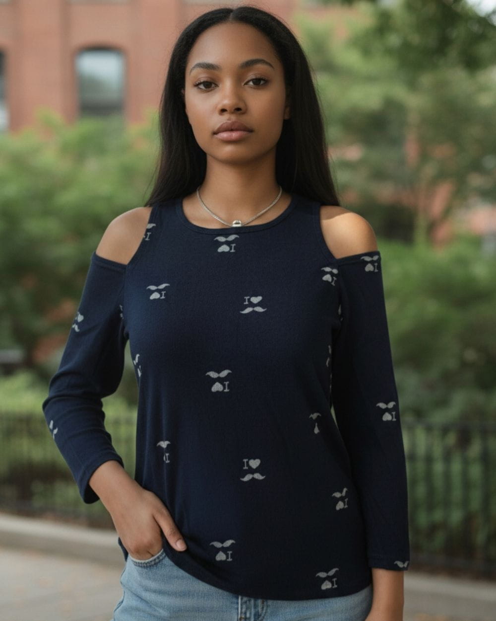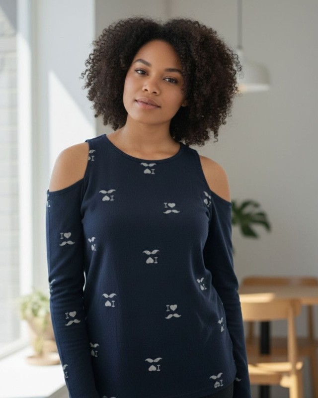 Mięciutka, przyjemna w dotyku i dla ciała bluzka damska cold shoulder - granatowa z delikatnym wzorem w jaśniejszym, kontrastowym kolorze.