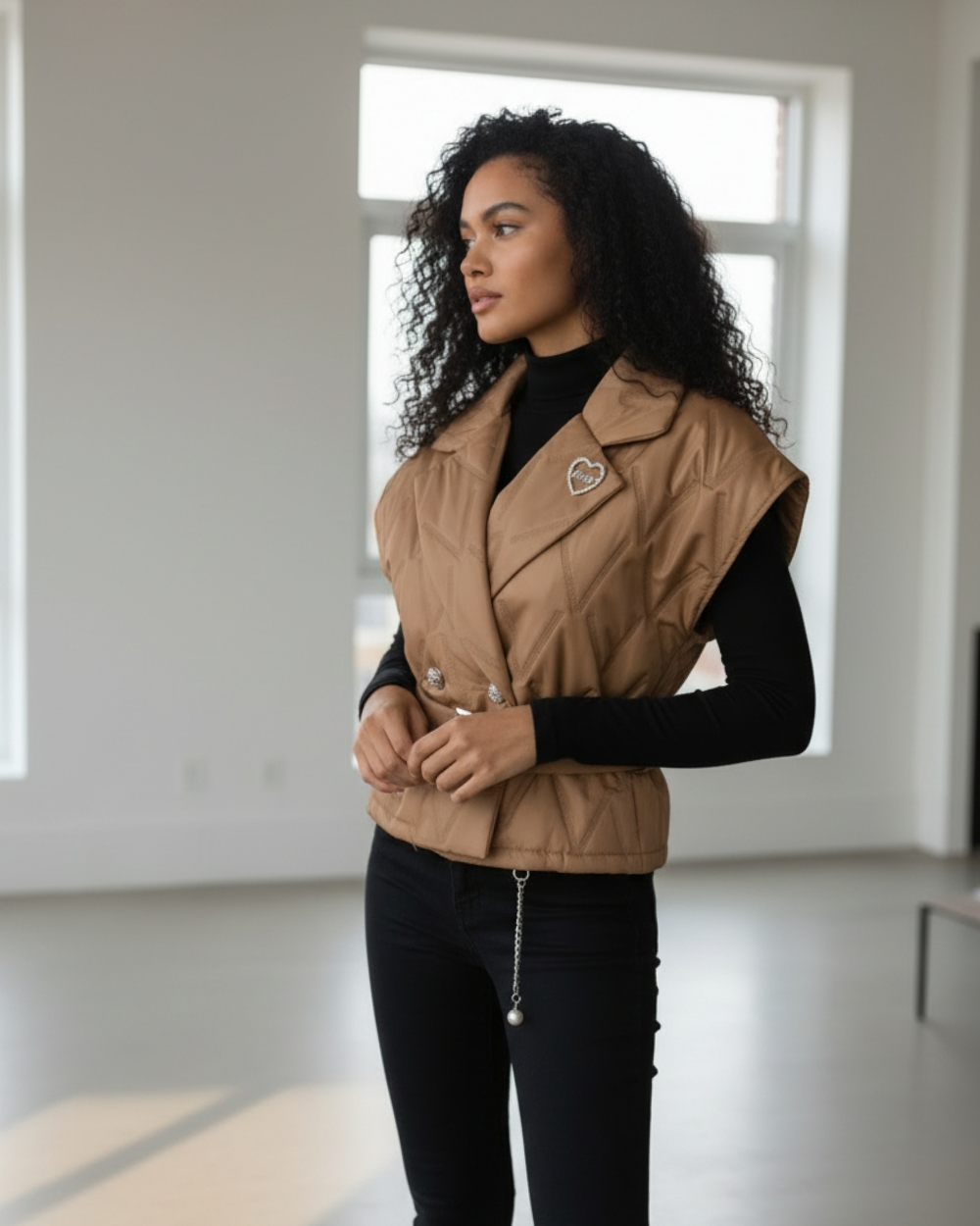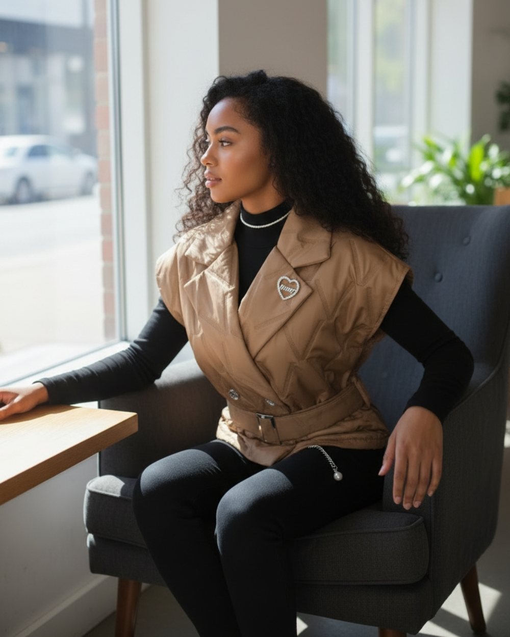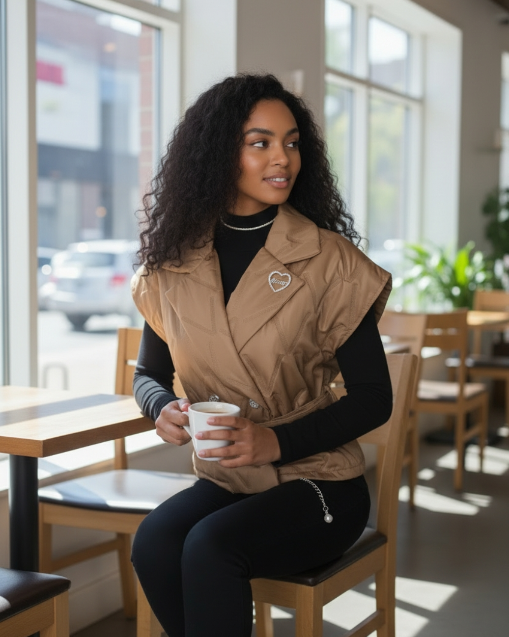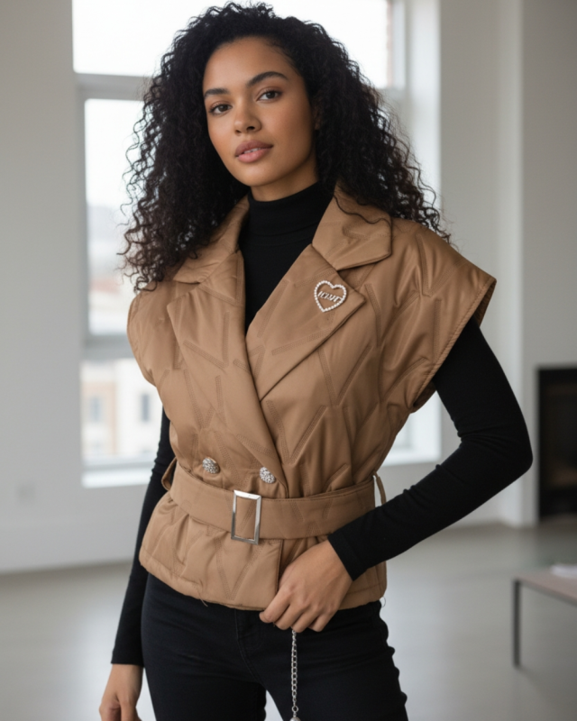 Pikowana kamizelka o fasonie marynarki, która odmieni każdą Twoją stylizację. Rozmiar uniwersalny plus dołączony pasek z klamrą sprawiają, że świetnie układa się na różnych sylwetkach.