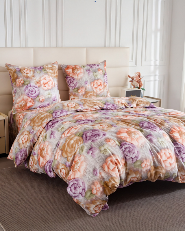 Wzór pościeli przedstawia gęsto rozmieszczone, okazałe kwiaty w urokliwych, pastelowych kolorach. Subtelne tło dodaje całości głębi i sprawia, że nadruk 3D prezentuje się niezwykle szlachetnie.