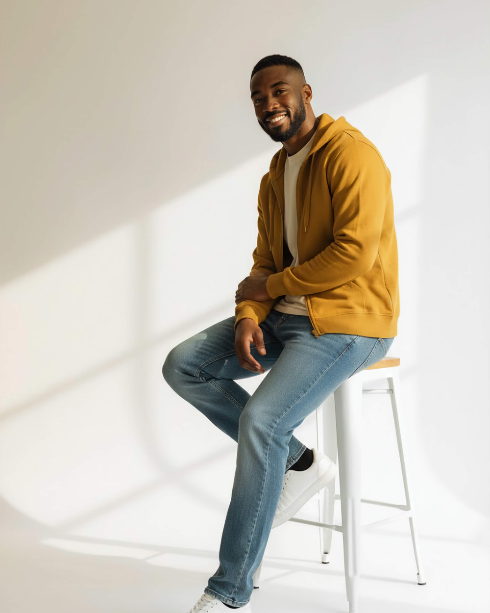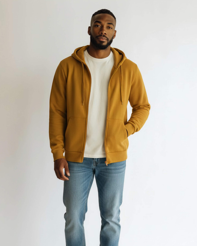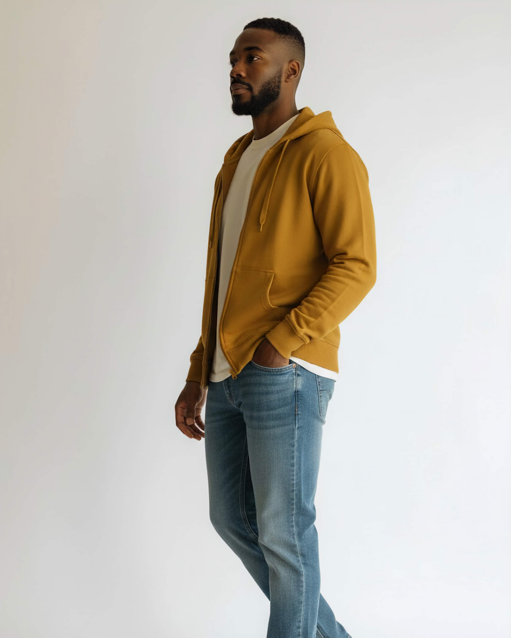 Rozpinana bluza z kapturem, w modnym, musztardowym kolorze, która stylowo uzupełni Twój look. Prosty krój, praktyczne kieszenie, regulowany kaptur - połączenie funkcjonalności z wyjątkowym komfortem.