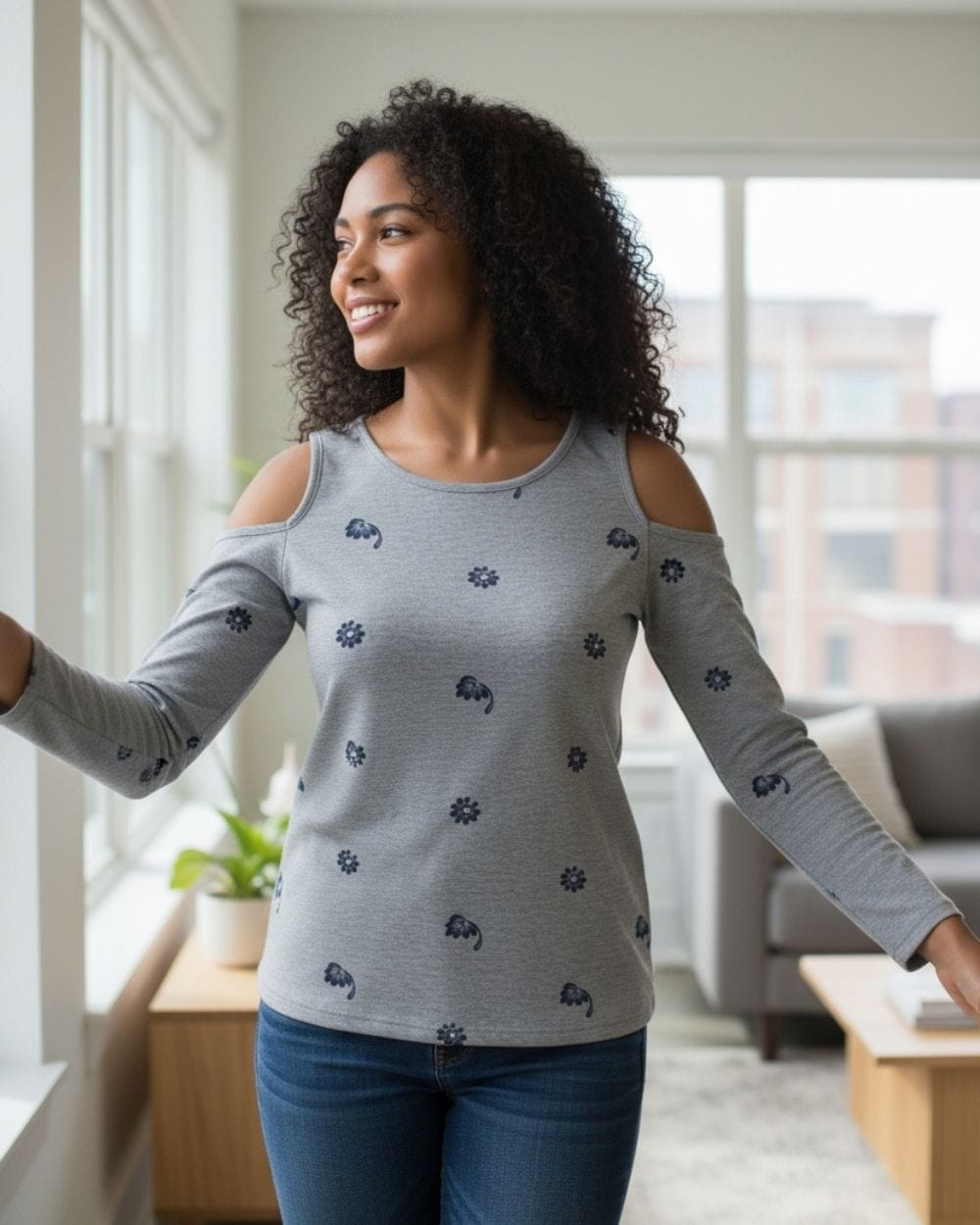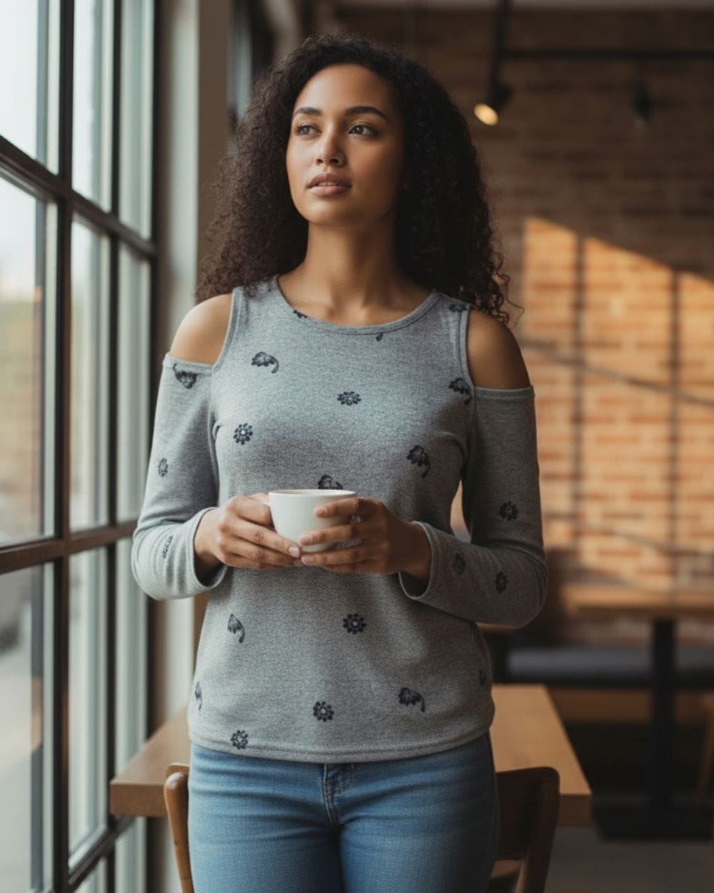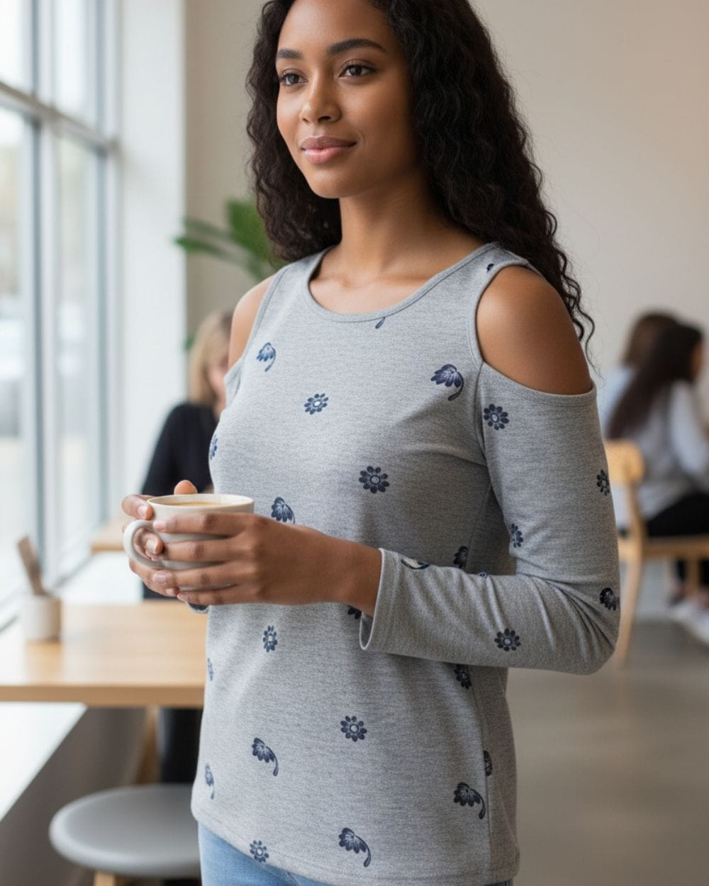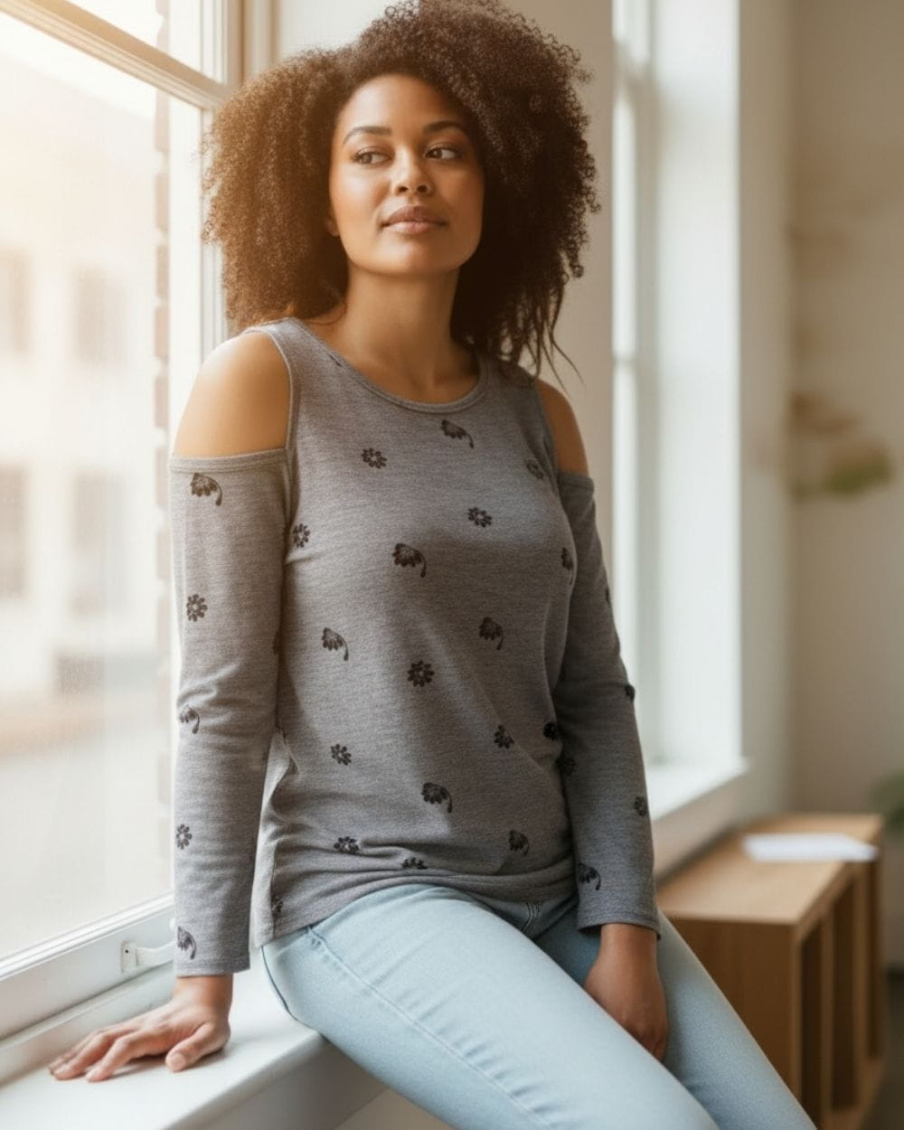 Mięciutka, przyjemna w dotyku i dla ciała bluzka damska z wycięciami na ramionach, które dodają lekkości.
