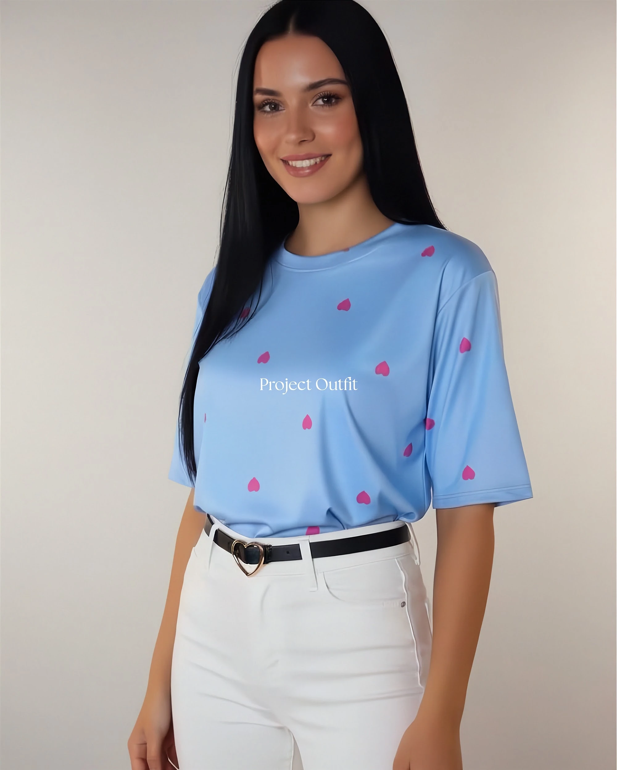 Bluzka w neonowe serduszka, z niezwykle przyjemnej dla ciała wiskozy, z modnymi poduszkami na ramionach
